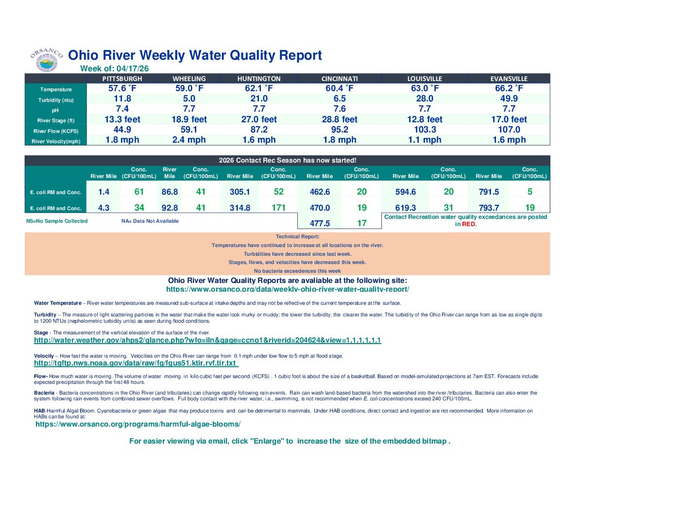 For more information on ORSANCO’s Weekly Water Quality Report, please contact Lila Xepoleas Ziolkowski.